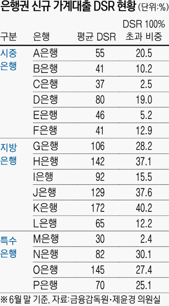또 은행 규모와 성격별로 각기 다른 고DSR 기준이 적용된다. 지방은행의 경우 시중은행에 비해 대출 고객들의 평균 DSR이 훨씬 높은 것으로 나타났기 때문이다.
