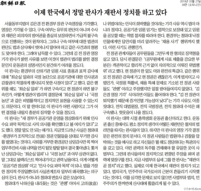 문제는 이 같은 신문이 불과 두 달도 채 안 된 성창호 판사의 김경수 전 경남도지사 법정구속 결정 때 더불어민주당과 온라인 등지에서 성 판사의 이력을 문제삼자 이를 ‘사법농단’ ‘선동’이라고 꾸짖었다는 점이다. 입에 침도 안바르고 자신의 논리를 헌신짝처럼 내팽게친 꼴이다.