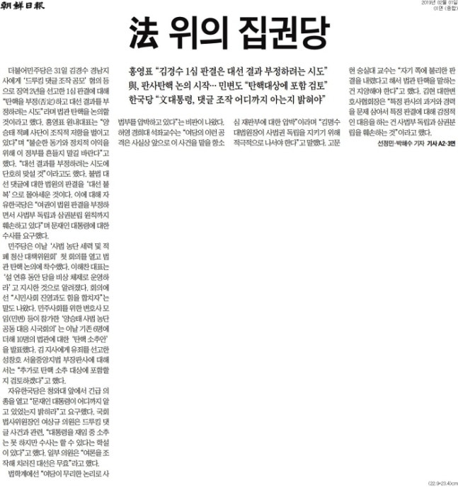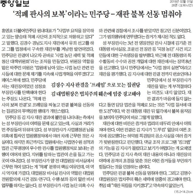 중앙일보도 같은날짜 사설 ‘‘적폐 판사의 보복’이라는 민주당…재판 불복 선동 멈춰야’에서 “민주당과 김 지사 측이 재판 내용이 아니라 재판장의 이력에 공격의 초점을 맞춘 것은 이런 증거들을 부인하기 힘들다는 것을 인정하는 셈”이라며 “민주당은 판결 불복 선동을 멈춰야 한다. 그리고 김명수 대법원장은 법치주의 훼손 세력에 엄중히 경고해야 한다”고 비난했다.