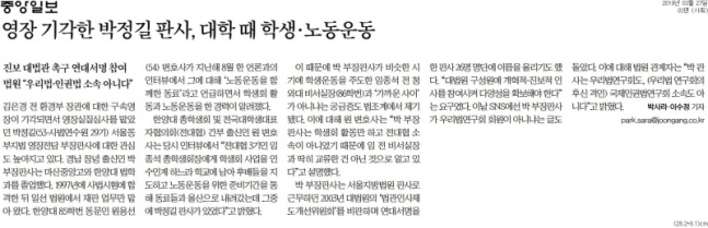 중앙일보도 3면 기사 ‘영장 기각한 박정길 판사, 대학 때 학생·노동운동’에서 한양대 85학번 동문인 원용선(54) 변호사가 지난해 8월 한 언론과의 인터뷰에서 박 판사와 ‘노동운동을 함께한 동료’라고 언급하면서 학생회 활동과 노동운동을 한 경력이 알려졌다고 소개했다. 중앙은 “이 때문에 박 부장판사가 비슷한 시기에 학생운동을 주도한 임종석 전 청와대 비서실장(86학번)과 ‘가까운 사이’가 아니냐는 궁금증도 법조계에서 제기됐다”며 “이날 SNS에선 박 부장판사가 우리법연구회 회원이 아니냐는 글도 돌았다. 법원 관계자는 ‘박 판사는 우리법연구회도, (우리법 연구회의 후신 격인) 국제인권법연구회 소속도 아니다’고 밝혔다”고 썼다.