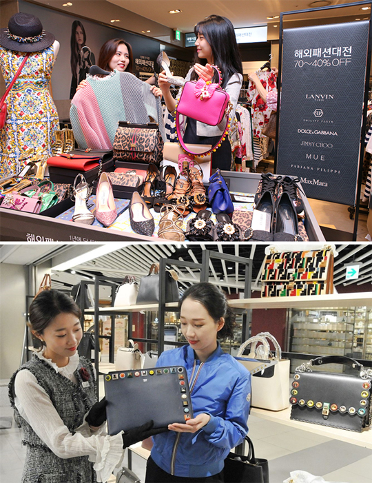국내 백화점들이 해외 명품 브랜드를 할인 판매하는 행사를 시작하는 가운데 현대백화점(위 사진)과 롯데백화점에서 고객들이 해외 명품 제품을 살펴보고 있다. 각 사 제공국내 백화점들이 이번 주부터 약 한 달간 해외 명품 브랜드를 최대 90%까지 싸게 판매하는 할인행사에 돌입한다.
