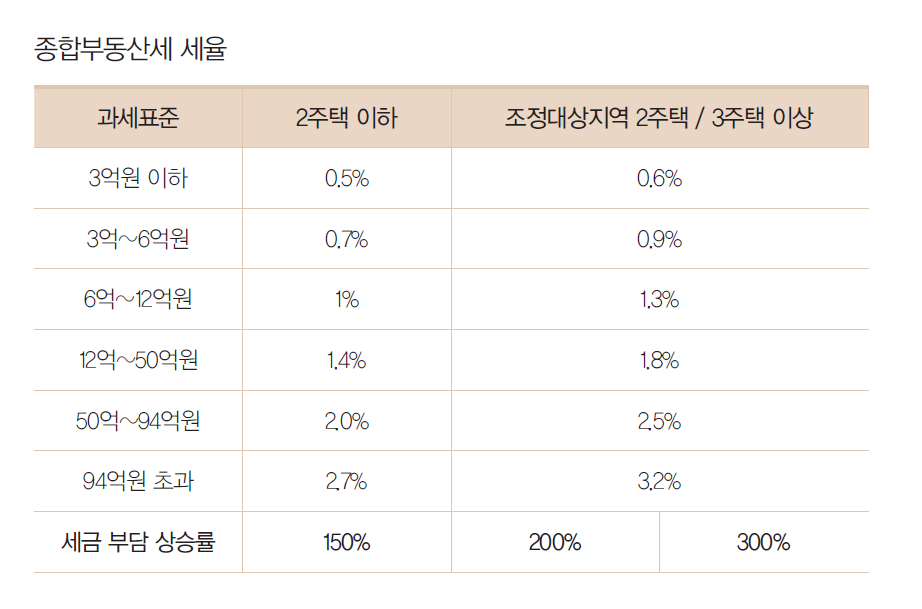 ② 종합부동산세 세율이 인상되었으며, 조정대상지역의 2주택자와 3주택 이상자에게는 가산세율이 적용됩니다.