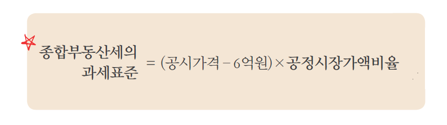 종합부동산세의 과세표준은 소유자별로 주택의 공시가격을 합산한 금액에서 6억원(단독명의 1세대 1주택자 9억원)을 공제한 후 공정시장가액비율을 곱해 구합니다.