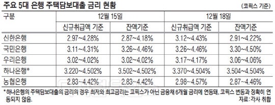 17일 금융권에 따르면 주택담보대출을 취급하는 국내 은행들은 18일부터 주택담보대출 금리를 일제히 올린다. 전국은행연합회가 지난 15일 주택담보대출의 기준금리가 되는 11월 기준 코픽스를 공시한 바에 따르면, 신규 취급액기준과 잔액기준 코픽스가 각각 0.15%포인트와 0.04%포인트 오른 1.77%와 1.66%를 기록했다.