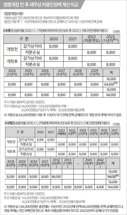 처분손실 이월공제의 경우에도 마찬가지로 해당 차량을 처분한 10년 이후에는 잔여액을 모두 손금산입할 수 있었던 것과 달리 앞으로는 연간 800만원 한도로만 손금산입이 가능하다.