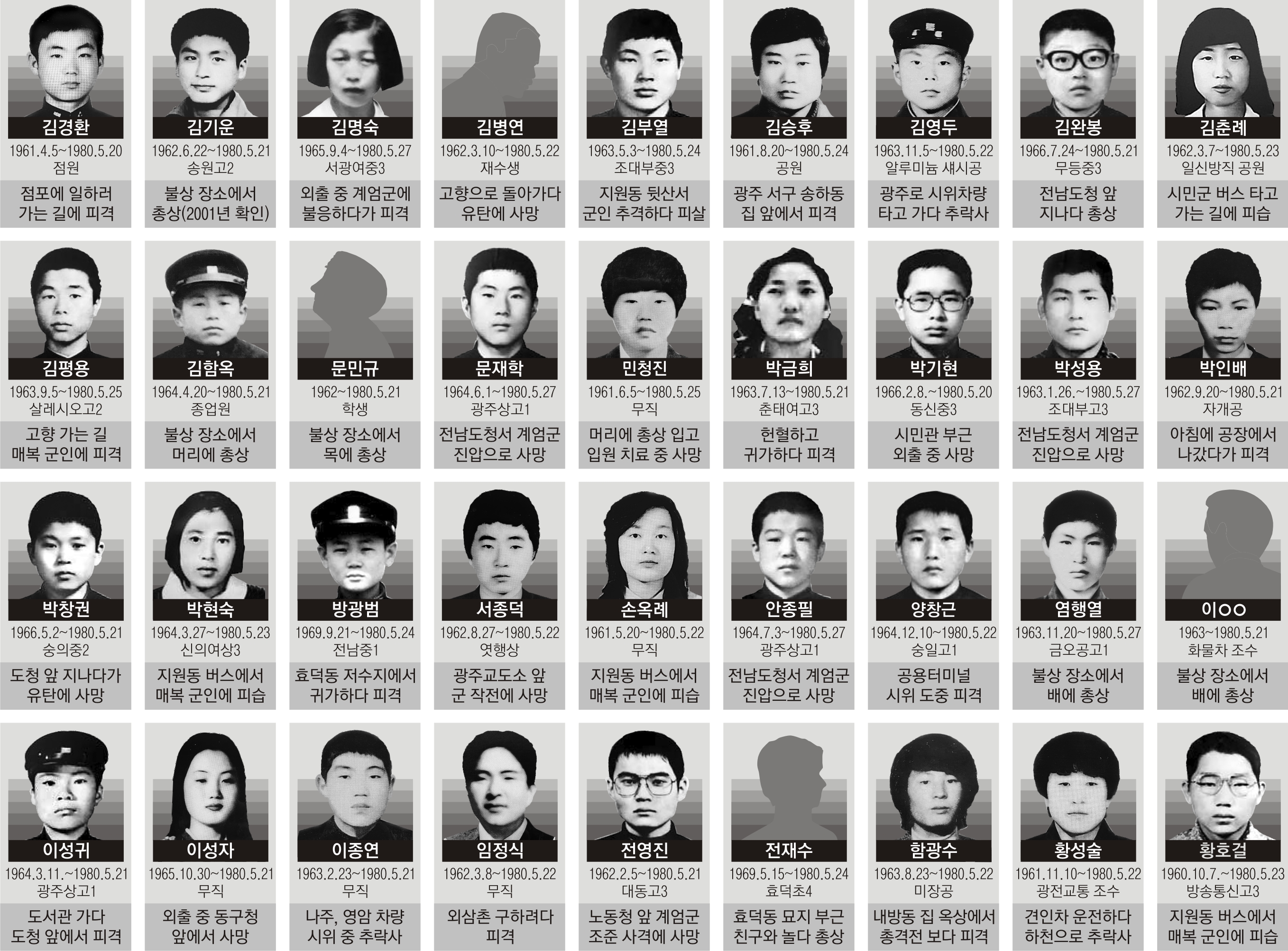 던 27일에는 5명이 숨졌다. 계엄군의 잔혹함은 말로 다할 수 없었다. 23일 사망한 손옥례(19·무직)양은 전남 화순으로 시신 담을 관을 구하러 가는 버스에서 매복한 군인에게 피습을 당해 사망했다. 당시 손양은 머리와 가슴 등 M16 총탄 7발을 맞았다. 그래도 부족했던지 계엄군은 손양의 가슴부위를 대검으로 찔렀다. 그렇게 손양의 주검은 2번 죽었다. 같은 버스를 탄 것으로 추정되는 황호걸(19·방송통신고3)군도 복부를 비롯해 9곳의 총상을 입었다.