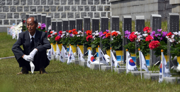 잊을 수 없는 그날의 아픔 - 5·18 민주화운동 40주년을 하루 앞둔 17일 광주 북구 국립 5·18민주묘지에서 희생자의 묘비를 찾은 유족이 마스크를 벗은 채 쪼그려 앉아 생각에 잠겨 있다.박지환 기자 popocar@seoul.co.kr