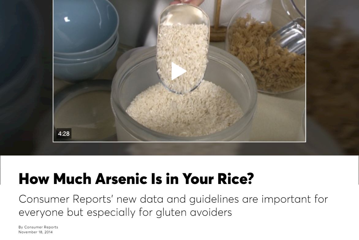 2012년의 끝무렵, 우리는 쌀에 함유된 비소에 관한 보고서를 발표했는데, 우리가 실험한 60여 종의 쌀과 쌀 생산품의 거의 전부에서 유의미한 수준의 비소가 검출되었다.