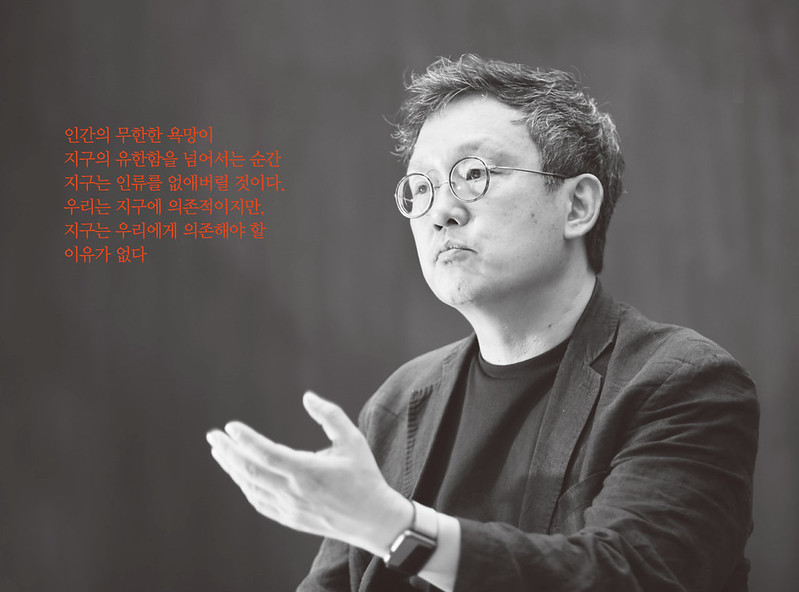 “대멸종 사건 공통점은 먹이사슬 맨 꼭대기에 올라간 종은 단 한 마리도 살아남지 못했다는 것이다. 생태계 자체가 무너진 상태에선 더는 진화를 통해 종이 유지될 수 없다. 그 멋들어진 공룡이 지금은 지구에 단 한 마리도 남아있지 않다. 인간의 무한한 욕망이 지구의 유한함을 넘어서는 순간 지구는 인류를 없애버릴 것이다. 지구는 그렇게 만만한 곳이 아니다.(웃음) 우리가 없어도 생명을 만들 수 있다. 우리는 지구에 의존적이지만, 지구는 우리에게 의존해야 할 이유가 없다.”