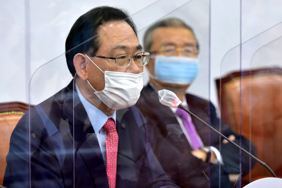 발언하는 국민의힘 주호영 원내대표 - 국민의힘 주호영 원내대표가21일 오전 국회에서 열린 비상대책위원회의에서 발언하고 있다. 2020.9.21 연합뉴스