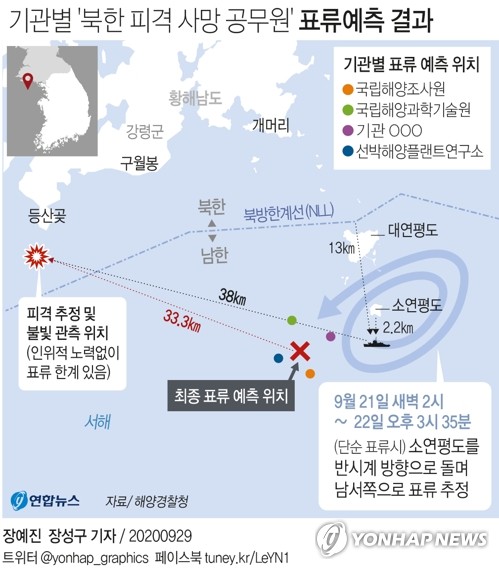윤 국장은 "표류 예측 결과와 실제 실종자가 발견된 위치는 상당한 거리 차이가 있었다"며 "인위적인 노력 없이 (소연평도 인근 해상에서) 실제 발견 위치까지 (단순히) 표류하는 것은 한계가 있다"고 말했다.