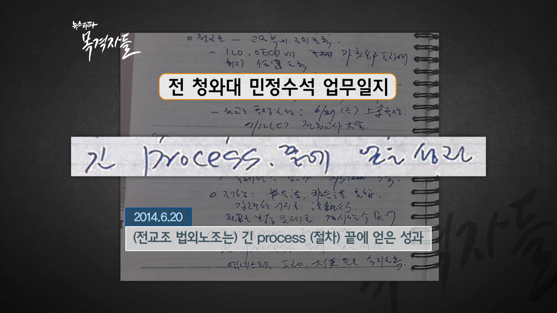 ▲ 故 김영한 민정수석의 비망록 중. 전교조 법외노조화에 대해 “긴 프로세스 끝에 얻은 성과”라고 적혀 있다. (2014년)