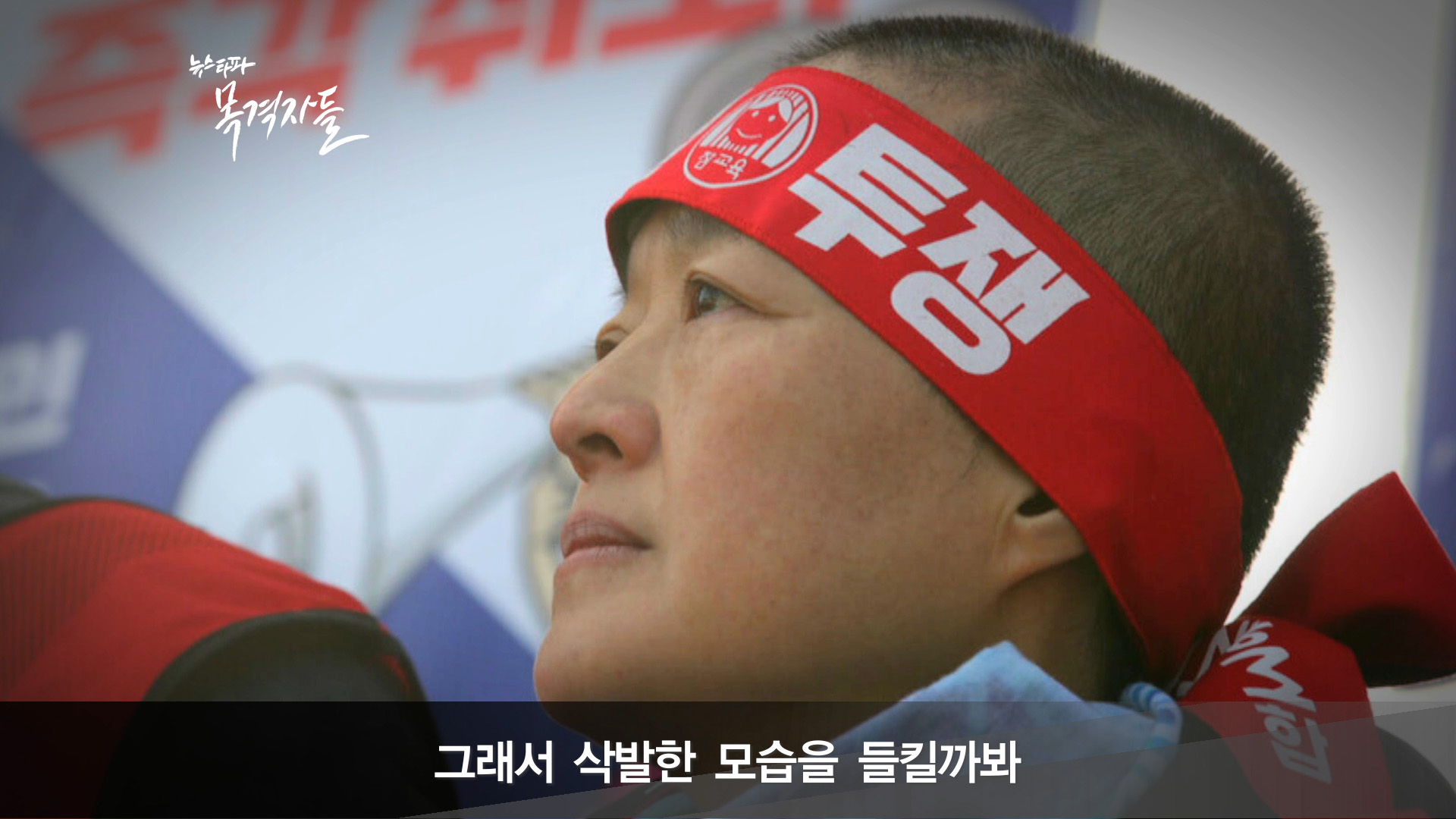 ▲ 삭발한 이민숙 해직교사 (2019년 모습) 이 교사는 1990년부터 역사 선생님으로 교단에 섰지만, 2016년 해고됐다.