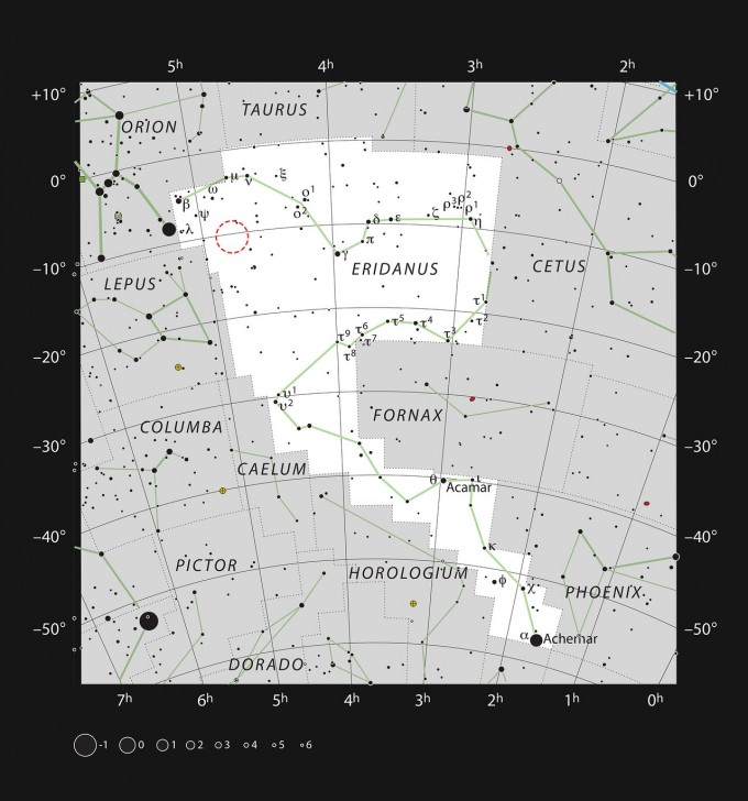 이번에 관측한 AT2019qiz의 위치를 빨간 점선 원으로 표시했다. 남반구의 별자리 에리다누스 중간에 위치한다. ESO 제공