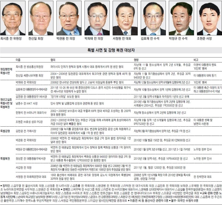 - 이명박 대통령은 비리 측근,사돈 사면을 강행한 것과 관련해서 "사면했다는 걸로 욕을 먹지만, 내 임기 중 발생한 권력형 비리는 안 하겠다는 약속만은 지켰다. (이번에) 민간인 사찰, 이런 건 사면 안했다. 최시중씨 같은 사람은 그 (임기 시작되기) 이전의 문제니까. 원칙은 몇 가지 지켰다. 측근 사면이라고 하는데 사실 진짜 측근은 안 했다"고 발언.