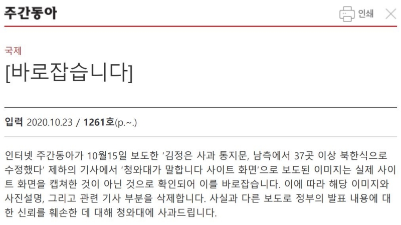 주간동아 “사실과 다른 보도로 정부 발표에 신뢰 훼손, 청와대에 사과”