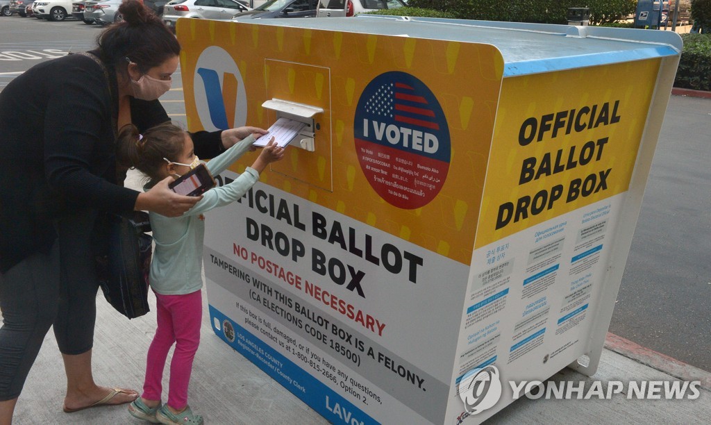 지난달 26일(현지시간) 미국 캘리포니아주 로스앤젤레스에서 한 소녀가 모친의 투표용지를 USPS 우편함에 넣고 있다.[UPI=연합뉴스]