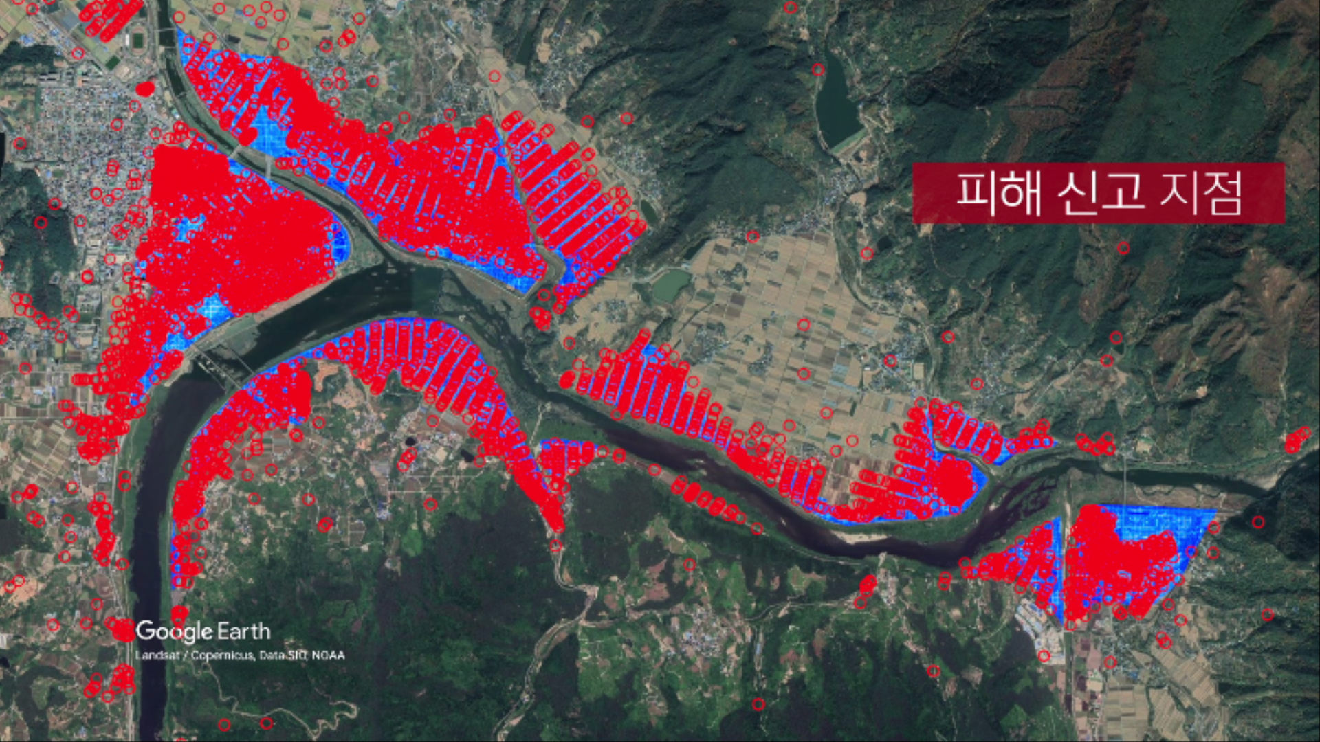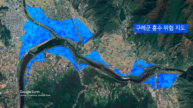 아래 사진은 올해 8월 섬진강 범람으로 혹독한 수해를 입은 전남 구례군의 홍수위험지도를 실제 침수 피해 신고 장소와 겹쳐본 것입니다. 보다시피 상당 부분 일치합니다.