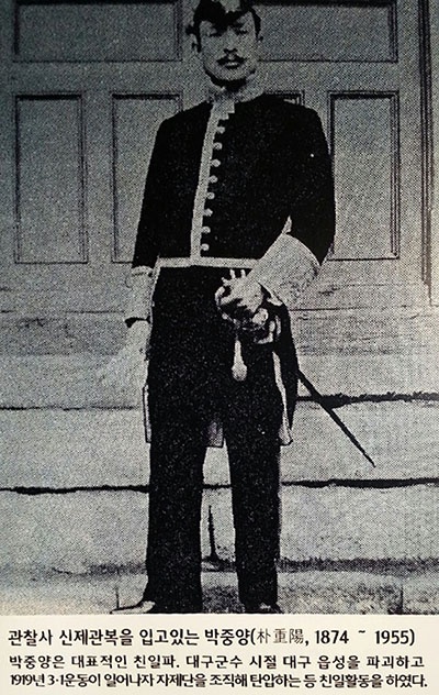 | ▲ 대구 중부경찰서(당시 대구경찰서) 내 전시실에 게시되어 있는 박중양의 모습. 사진 아래에 '박중양은 대표적인 친일파'라는 설명이 붙어 있다. 1946년 당시 시민들은 잠시 대구경찰서를 점거하기도 했다. |