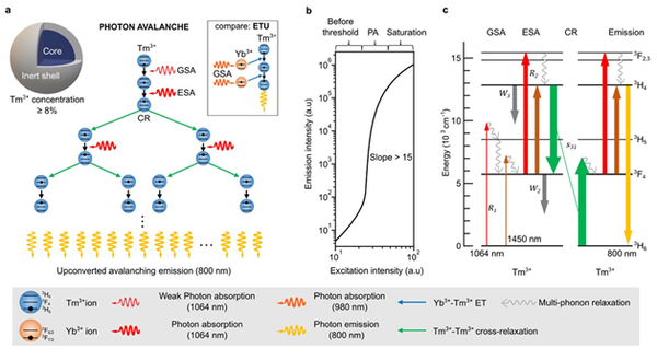 [그림2] 툴륨 이온(Tm3+)이 도핑된 나노입자 내부에서의 빛의 광사태(PA: Photon Avalanche) 연쇄증폭반응의 메커니즘 [사진 출처=성균관대학교]