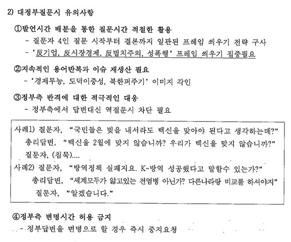 대정부질문은 오는 4일 정치‧외교‧안보‧통일 분야에 대한 질문부터 오는 8일까지 주말을 제외하고 3일간 진행된다. 해당 문건은 당 소속 모든 의원들이 아니라 대정부질문에 나설 의원들에게만 배포된 것으로 보인다.