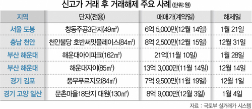 서울경제가 국토부 실거래가 시스템을 분석한 결과 수도권과 부산, 충남 천안 등 투자 수요가 몰렸던 지역을 중심으로 신고가 거래가 한 달 내 취소된 사례가 여럿 발견됐다.