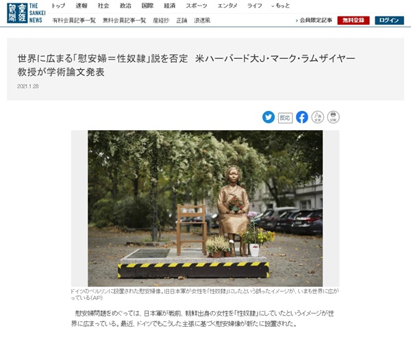 ▲ 일본군 위안부의 강제성을 부정하는 마크 램지어 하버드대 교수의 논문을 소개하는 <산케이신문> 갈무리. |