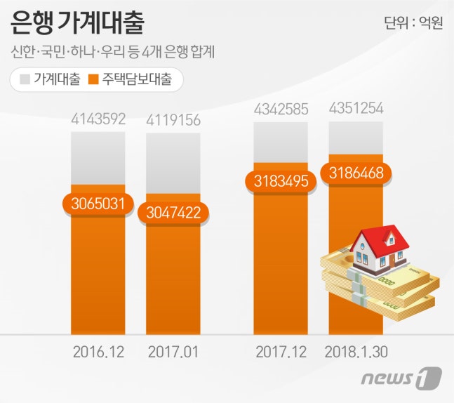 1일 4대 시중은행(신한·KB국민·우리·KEB하나)에 따르면 지난달 30일 기준 은행 주택담보대출 잔액은 총 318조6468억원으로 전월(318조3495억원)보다 2973억원 늘었다. 전체 가계대출 잔액도 지난달 30일 기준 435조1254억원으로 8669억원 증가했다.