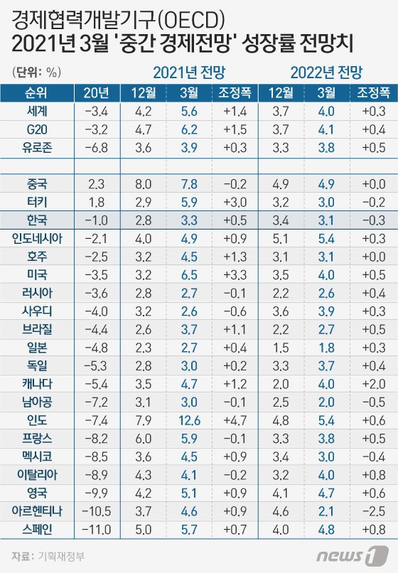 경제협력개발기구(OECD)가 한국의 올해 성장률 전망치를 3.3%로 종전보다 0.5%포인트(p) 올렸다. 한국의 경제회복 속도가 예상보다 빠르다는 게 OECD 측 의견이다. 신종 코로나바이러스 감염증(코로