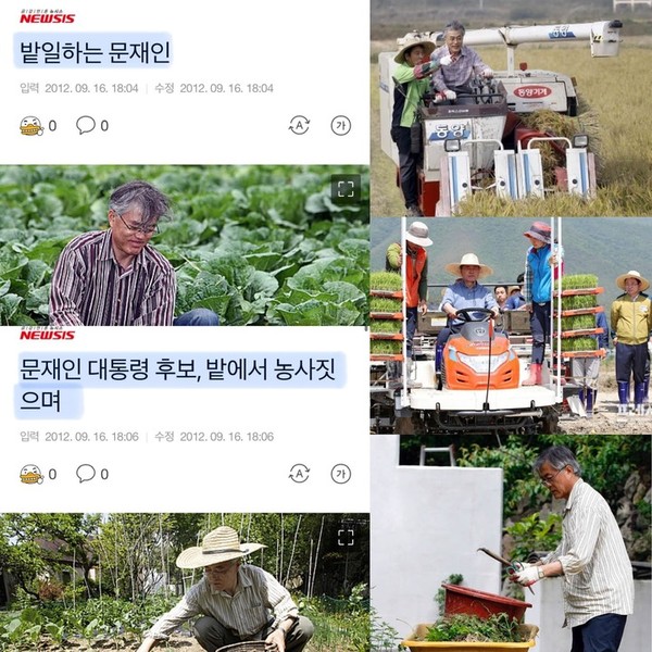 뉴시스는 지난 2012년 9월 16일 '밭일하는 문재인' 제목의 사진을 올리고 "민주통합당 문재인 후보가 16일 오후 경기 고양실내체육관에서 열린 18대 대통령후보 경선에서 13번째 1위를 차지하며 대통령후보로 선출됐다. 사진은 노무현 전 대통령 서거 후 문재인 의원이 밭일을 하고 있다"라고 설명을 첨부했다.