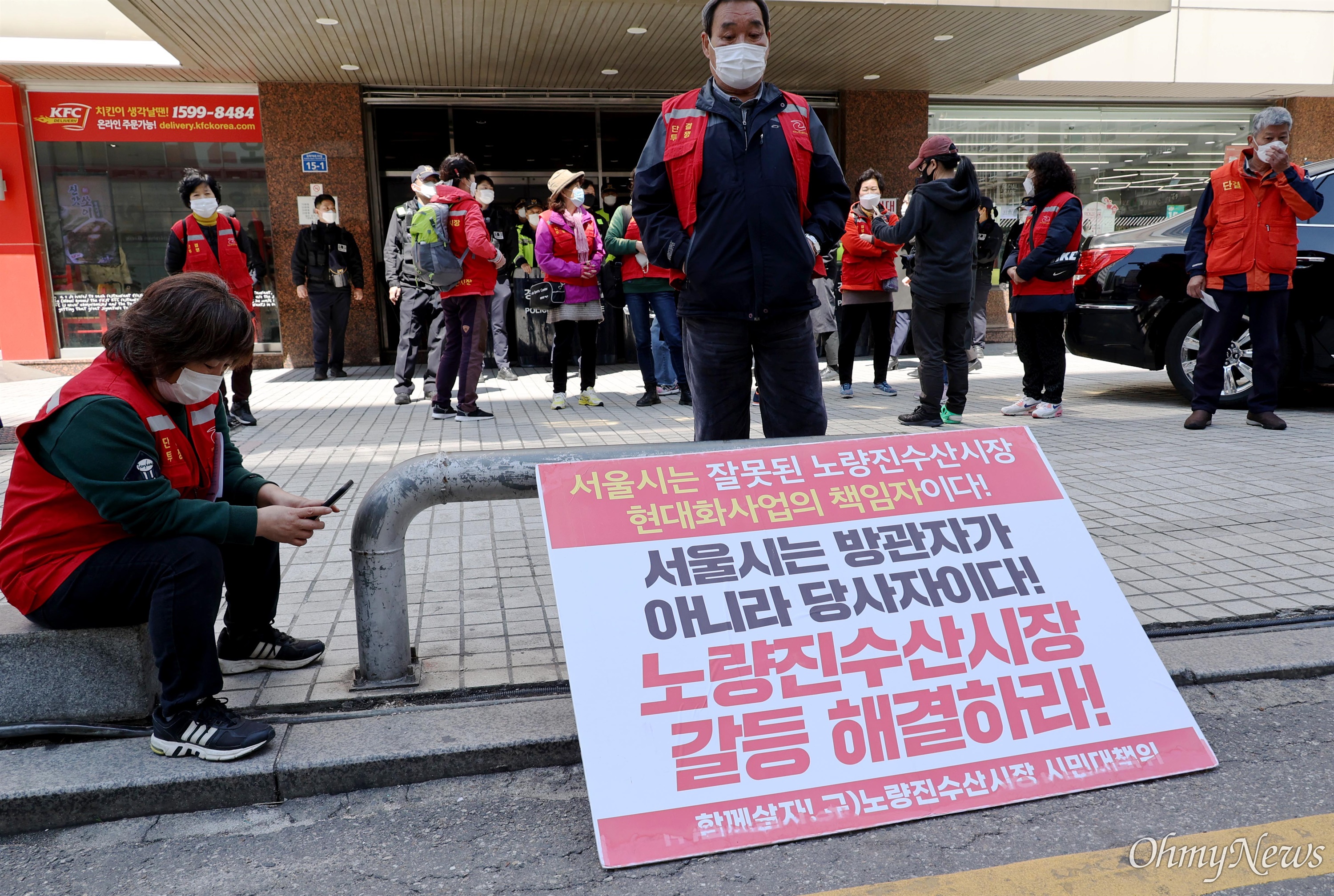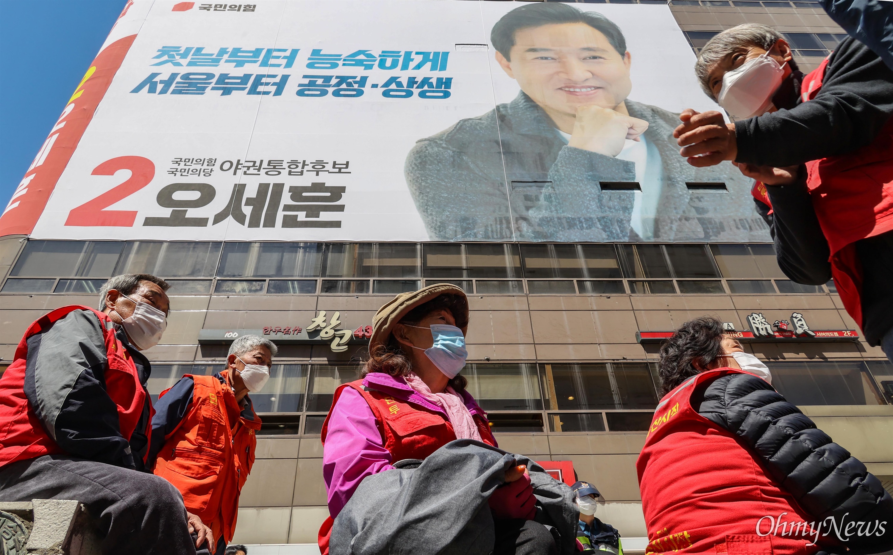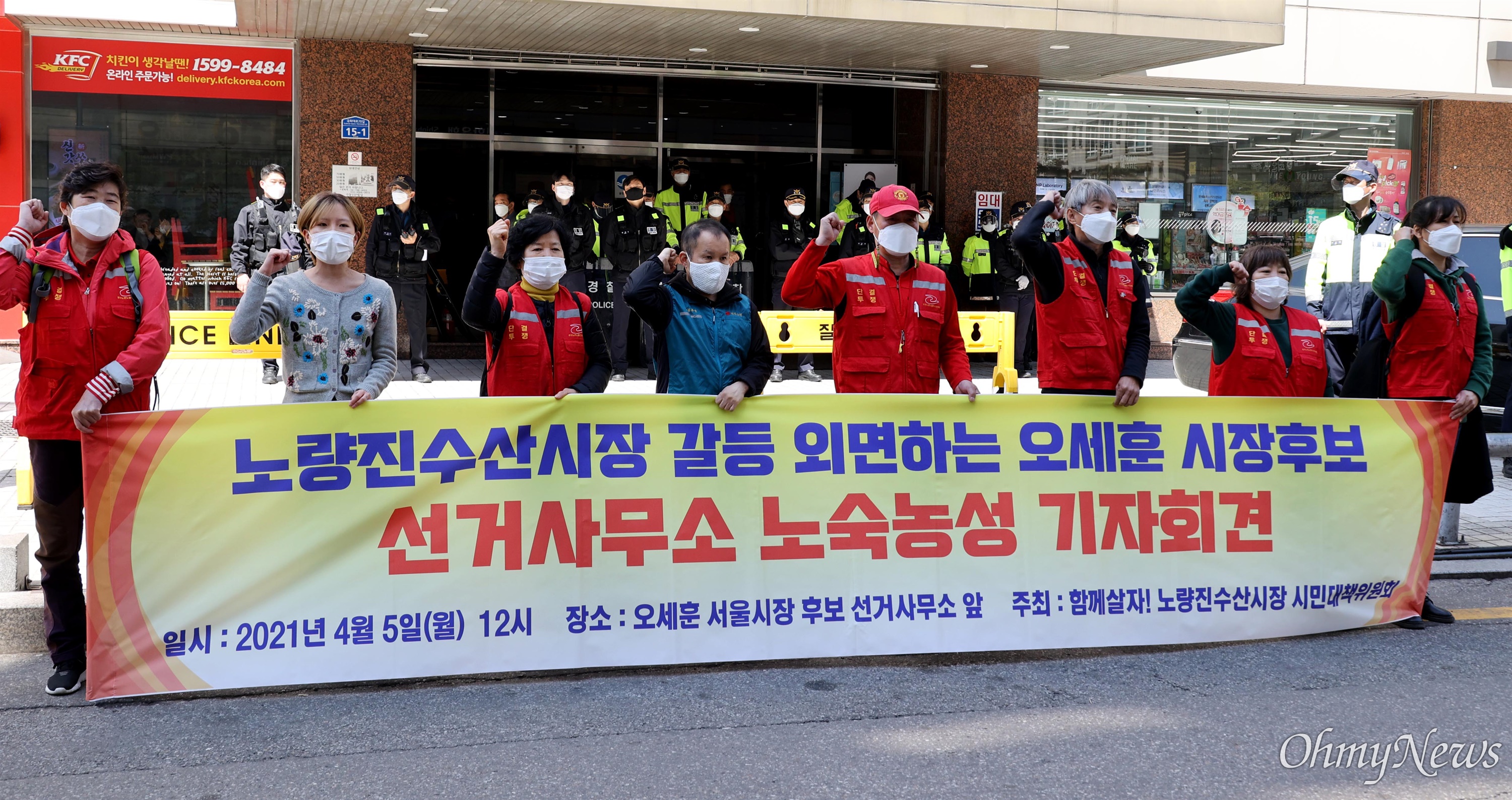 노량진수산시장 구시장 상인과 시민대책위 회원들은 5일 오후 서울 여의도 서울 여의도 오세훈 국민의힘 서울시장 후보 선거사무소 앞에서 기자회견을 열고, "오 후보는 (노량진수산시장 갈등에 대해) 어떠한 답변도 하지 않고 무응답으로 일관하고 있다"며 "오 후보를 만나게 될 때까지 자리를 떠나지 않을 것이다"고 말했다.