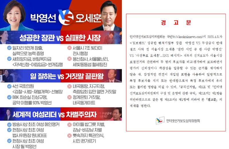 인터넷선거보도심의위원회가 부족한 근거를 바탕으로 박영선 오세훈 두 후보를 비교한 서울의소리, 국민뉴수, 굿모닝충청에 ‘경고문게재 및 경고문게재 알림표시’ 제재를 결정했다. 서울의
