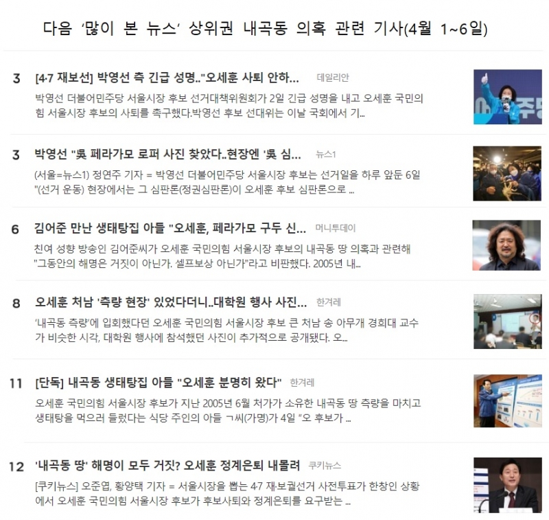 다음에서 ‘내곡동’ 의혹과 관련해 단순 공방처리 형식의 기사, 오세훈 후보에 우호적인 기사를 제외하고 오세훈 후보에 비판적인 관련 기사만 집계해도 랭킹에 오른 기사가 적지 않았다.