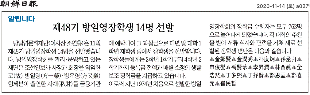 ▲ 2020년 11월 14일 조선일보 2면, 제48기 방일영장학생 14명 선발