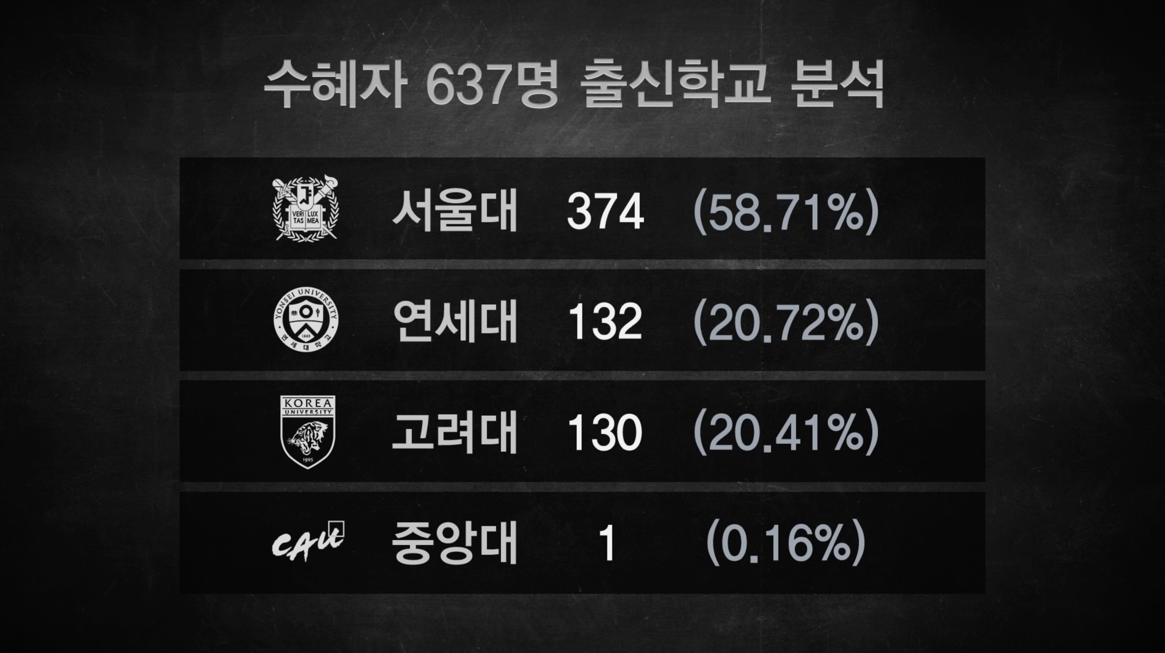 1974년 이후 지금까지 763명이 방일영장학회의 장학금 수혜를 받았다. 장학생 가운데 출신 학교 확인이 가능한 637명 대상으로 분석했다. 단 한 명 빼고 전부 서울대, 연세대, 고려대 출신이었다. 서울대 58%로 374명, 연세대 20%로 132명, 고려대 20%로 130명이다. SKY를 뺀 단 1명은 중앙대 출신이었다.
