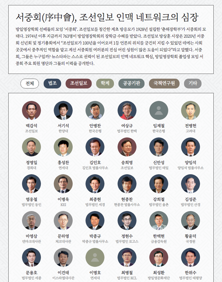 뉴스타파는 스스로 권력이 된 조선일보의 인맥 네트워크 핵심, 방일영장학회 졸업생 모임 서중회의 주요 회원 141명 명단과 그들의 이력을 공개한다.