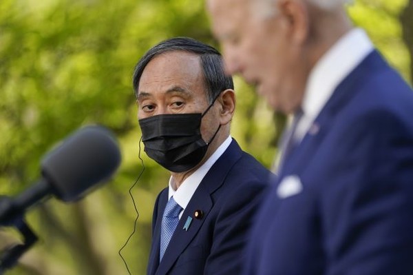 ▲ 스가 요시히데 일본 총리가 16일(현지시간) 워싱턴의 백악관 로즈가든에서 열린 미·일 정상 공동 기자회견에서 조 바이든 미국 대통령이 발언하는 모습을 지켜보고 있다. [사진 : AP뉴시스]