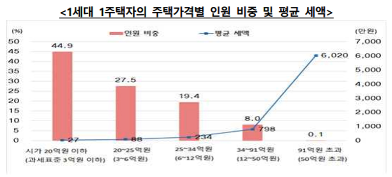 반면 1세대 1주택자는 당해 연도 종부세 고지 세액(5.7조 원) 중 고작 3.5%(13.2만 명, 0.2조 원)를 부담하며, 전년도 대비 종부세에서 차지하는 인원 비중과 세액이 모두 줄었다. 공제금액을 기존의 9억 원에서 11억 원으로 올린 데다(실거래가 기준 13억~16억 원), 장기보유특별공제와 고령자공제 합산공제율을 기존 최대 70%에서 80%로 상향하는 등 1세대 1주택자 보호를 더 두텁게 했기 때문이다.