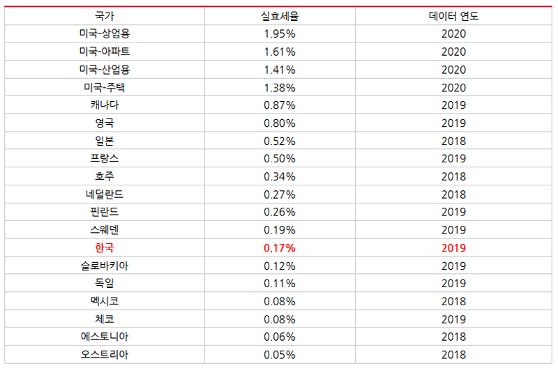 사정이 이러함에도 아래 표가 잘 보여주듯 대한민국 보유세 실효세율은 선진국 가운데 하위권에 속한다. 부동산 투기 억제 및 불로소득 환수의 최적 정책수단인 보유세 실효세율이 이렇게 낮으니 투기를 막을 길도, 치솟는 부동산을 잡을 방도도 없는 것이다.