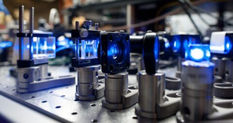 양자 통계가 극저온 가스에서 빛의 산란에 어떤 영향을 미치는지 측정하는 파란색 레이저 광선. ©Christian Sanner, Ye labs/JILA