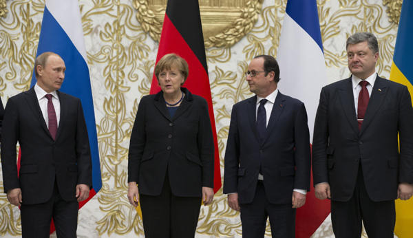 블라디미르 푸틴 러시아 대통령, 앙겔라 메르켈 독일 총리, 프랑수아 올랑드 프랑스 대통령, 페트로 포로셴코 우크라이나 대통령(왼쪽부터)이 2월 11일 벨라루스 수도 민스크에서 미국을 배제한 채 우크라이나 평화협정 체결을 위한 회의를 하기에 앞서 기념사진을 찍고 있다. / AP연합뉴스
