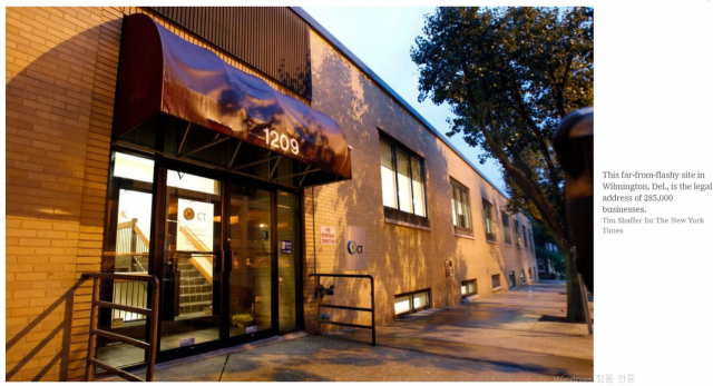 1209, North Orange Street, Wilmington, Delaware. 이 주소엔 사진에 보듯 조그만 2층짜리 건물이 있다. 놀라지 마시라. 이 주소에 세계 굴지의 기업들이 다 소재해 있으니까. 아메리칸항공, 애플, 뱅크 오브 아메리카, 버크셔해서웨이, 카길, 코카콜라, 포드, 제너럴 일레트릭, 구글, JP모건 체이스, 월마트, 이베이, 버라이존 등 무려 30만 개 회사가 같은 주소를 공유하고 있다. 대행사 CT코퍼레이션(CT Corporation)을 통해서다. 2012년 <뉴욕타임스>에는 그 주소에 등기를 한 회사가 28만5000개였으나, 2018년 현재 30만 개로 늘었다.(☞ 관련 기사 : <비즈이스 인사이더> 2018년 12월 28일 자 'This tiny building in Wilmington, Delaware is home to 300,000 businesses')