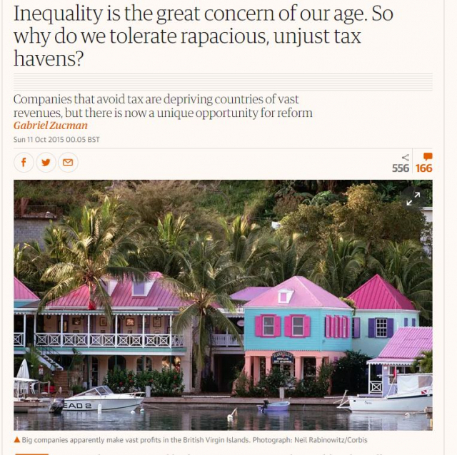 둘째로 법인세는 자본에 과세하는 것이다. UC버클리 경제학과 교수 주크먼(Gabriel Zucman)에 따르면, 현재 미국에서 자본 과세에서 법인세가 차지하는 비중은 3분의 1에 해당한다. 나머지는 재산세 및 자본 이득에 대한 개인 과세다. 이런 상황에서 법인세를 회피하게 되면 결국 자본을 가진 소유주들만 좋은 셈이 된다. 자본과세의 감소는 자본 소유자의 수익률 증대를 의미하고, 그것은 곧 부의 불평등의 심화와 궤를 같이한다. 그래서 주크먼은 "불평등이 우리 시대 가장 큰 문제인 상황에서, 왜 우리는 그렇게 탐욕스럽고 공정치 못한 조세천국을 용인하는가?"라며 울분을 토한다.(☞ 관련 기사 : <가디언> 2015년 10월 Gabriel Zucman 칼럼 'Inequality is the great concern of our age. So why do we tolerate rapacious, unjust tax havens?')
