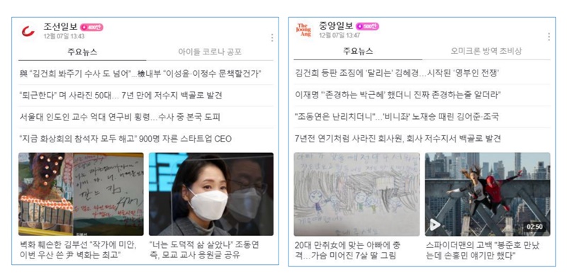 발제를 맡은 김창숙 이화여대 연구교수는 지난해 12월7일자 조선일보와 중앙일보 네이버 모바일 구독 페이지 메인 화면에 걸린 기사들을 예로 들며 “자세히 살펴보면 비아냥거림, 갈등을 조장하고 따옴표 인용 중계 방식의 제목들이다. 내용도 선정적이고 자극적인 사건들이다. 대선 후보자 부인 간 대결 구도 조장 등이다. 전통을 가진, 최고부수를 지닌 언론사들의 대표 기사라고 하기엔 부적절하다”고 설명했다
