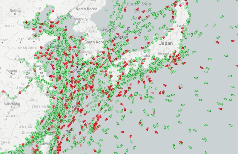 한국시간 20일 오전 11시 기준, 중국과 한국, 일본 연안에 몰려있는 컨테이너선(초록색), 유조선(빨간색)의 모습. 사진=마린트래픽