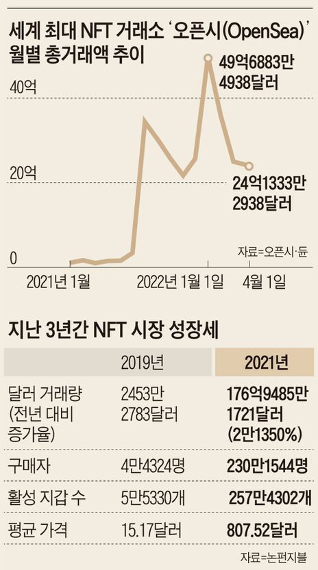 지난해 폭발적인 성장세를 보인 NFT 시장은 올해 들어 급락을 면치 못하고 있다. 가상자산 시장조사기관 체이널리시스 등에 따르면, 지난해 410억달러(약 51조원)까지 커졌던 NFT 시가총액은 현재 100억달러 수준으로 4분의 1토막 났다. 올 1월까지만 해도 50억달러대를 유지하던 세계 최대 NFT 거래소 오픈시(OpenSea)의 총 거래액은 4월 현재 24억달러로 급감했다. 같은 기간 거래 이용자 수도 94만8000명에서 63만5000명으로 줄었다.
