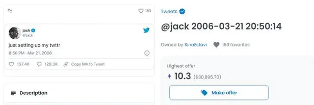 지난해 3월 블록체인 기업 브리지 오라클의 시나 에스타비 CEO(최고경영자)가 트위터 창업자 잭 도시의 세계 첫 트위터 게시글 NFT(대체 불가능 토큰)를 291만달러(약 37억원)에 사들이며 한 말이다. 당시 그는 “디지털 자산의 형태로 기록된 인류의 역사”라며 “인류 역사상 최초의 트윗이 50년 후에 가격이 얼마나 될지 누가 알겠는가”라고 했다. 1년이 흐른 지난 5일 그는 이 NFT를 다시 경매에 내놨는데, 현재 최고 입찰가는 10.3이더리움(약 3만달러·3800만원)에 불과하다. 자칭 ‘디지털 모나리자’의 가치가 오르긴커녕 99% 가까이 폭락한 것이다.