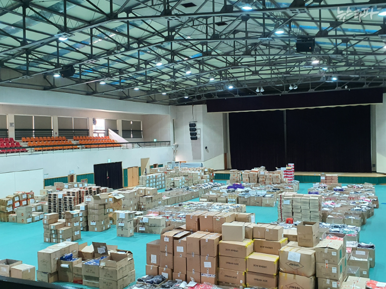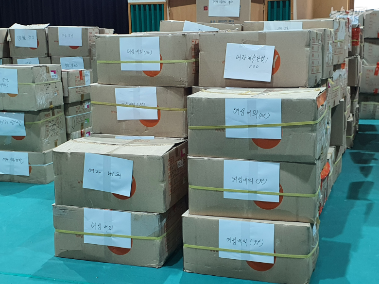 박스마다 쌓여있는 옷가지들. 전국 각지에서 이재민들을 위해 보낸 구호 물품들이다.