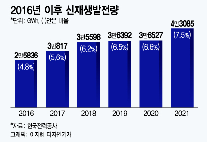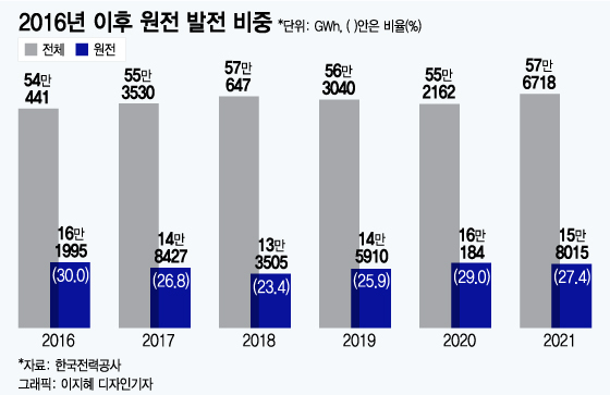 원전 발전량도 문재인정부 시작과 함께 내리막을 걸었다. 2016년 16만1995GWh(기가와트시)였던 원전 발전량은 2017년 14만8427GWh로 8.4% 줄어들었고 2018년에는 13만3505GWh로 최저치를 기록했다. 이어 △2019년 14만5910GWh △2020년 16만184GWh △2021년 15만8015GWh 순으로 집계됐다. 2016년 원전은 전체 발전량의 30%를 책임졌으나 2018년 23.4%까지 발전 비중이 떨어졌다.