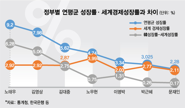 문재인정부의 평균 경제성장률은 2.3%로, 분기 평균 경제성장률이 2% 아래로 내려온 것은 이번 정부가 처음이다. 평균 경제성장률은 시간이 지남에 따라 점차 낮아지는 모습을 보였는데 △노태우정부 8.7% △김영삼 정부 7.6% △김대중 정부 6% △노무현 정부 4.8% △이명박정부 3.2% △박근혜정부 3.1% 등으로 나타났다.